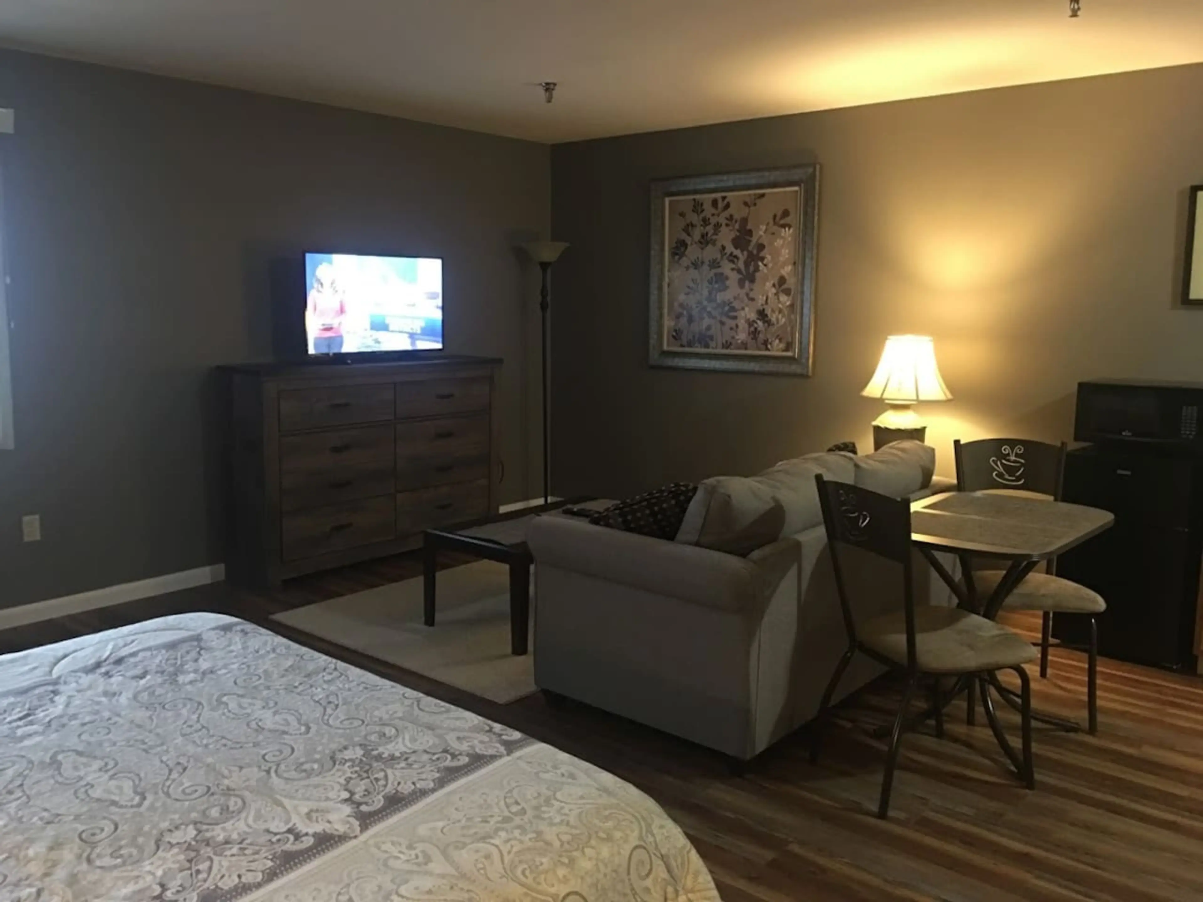 Efficiency studio with mini fridge, microwave, coffee pot but no kitchen. No stove. Unit has a queen size bed as well as a sleep sofa and comes with all bedding and towels. Enjoy the day and then dine at the fabulous on-site restaurant! Plenty of parking under the carport. Located 3 miles from ...